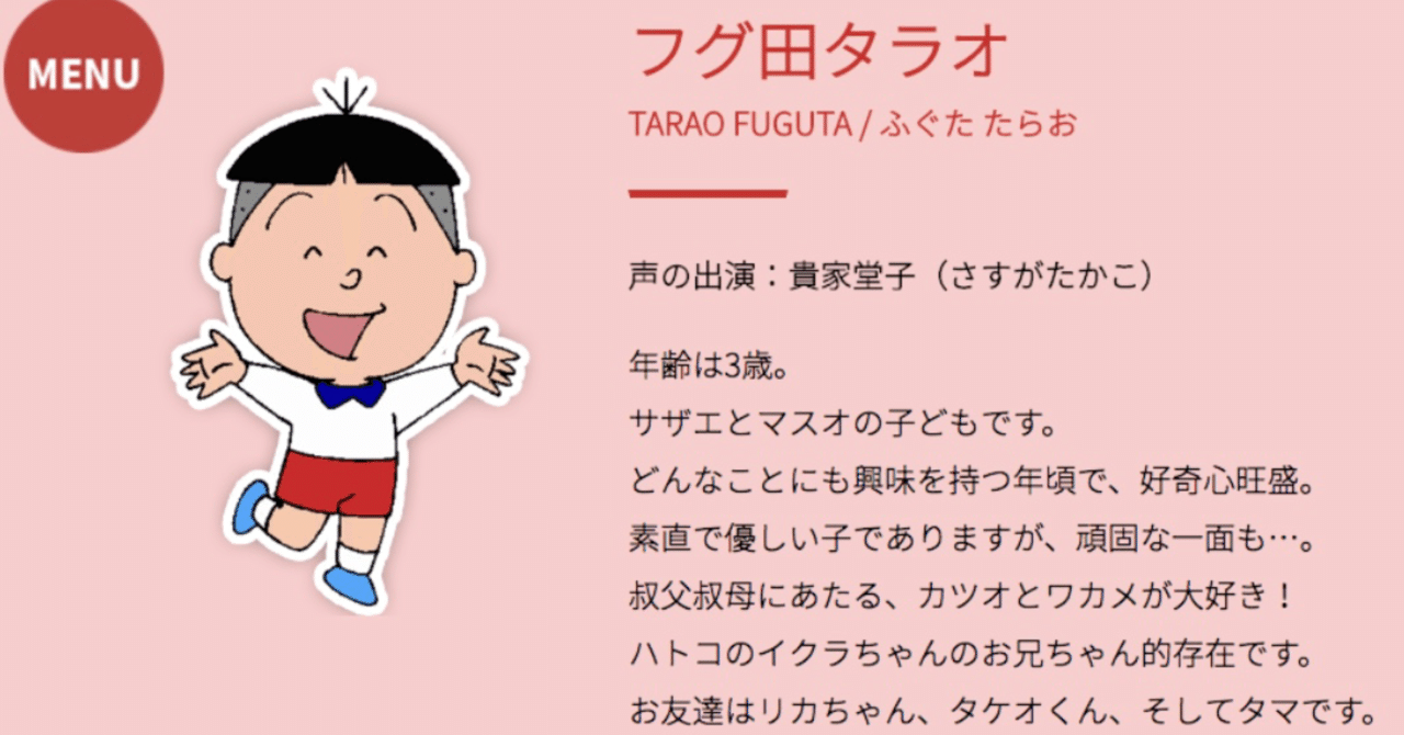 . 東京府 出身 5. フジテレビのアニメ サザエさん で1969年の放送開始からフグ田タラオ. Web キャラクター紹介タラちゃんのともだち サザエさん - 公式ホームページ毎週日曜よる6時30分放送サザエさんがテレビで放送開始されたのは昭和44年いつも明る.